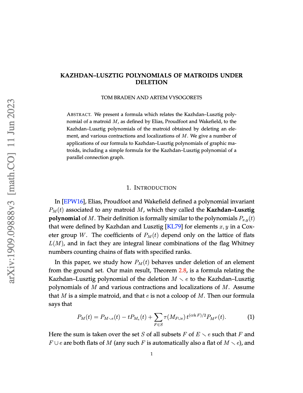 Braden, T., Vysogorets, A. (2020). "Kazhdan-Lusztig Polynomials of Matroids Under Deletion".