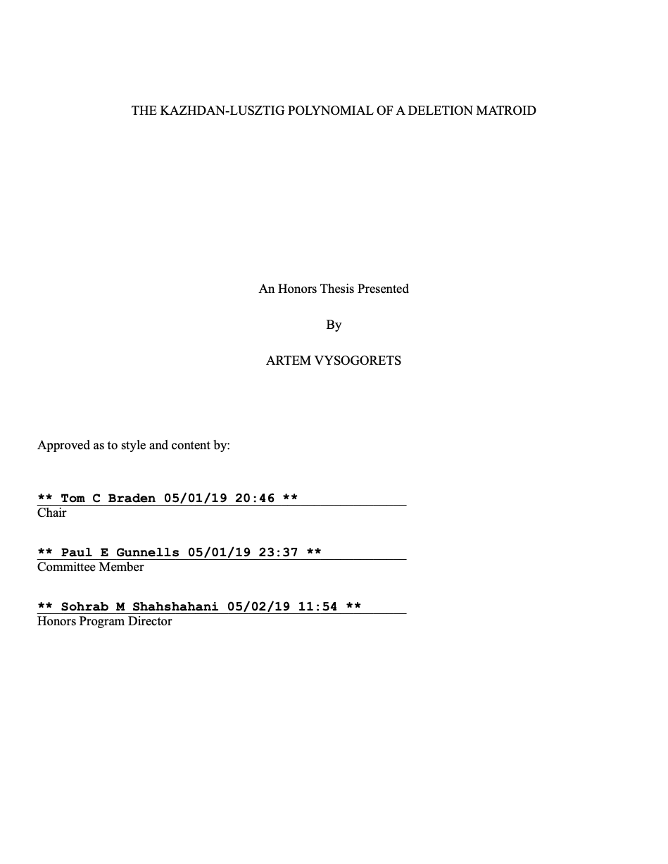 Vysogorets, A., "The Kazhdan-Lusztig Polynomial of a Deletion Matroid". Advised by Tom Braden.